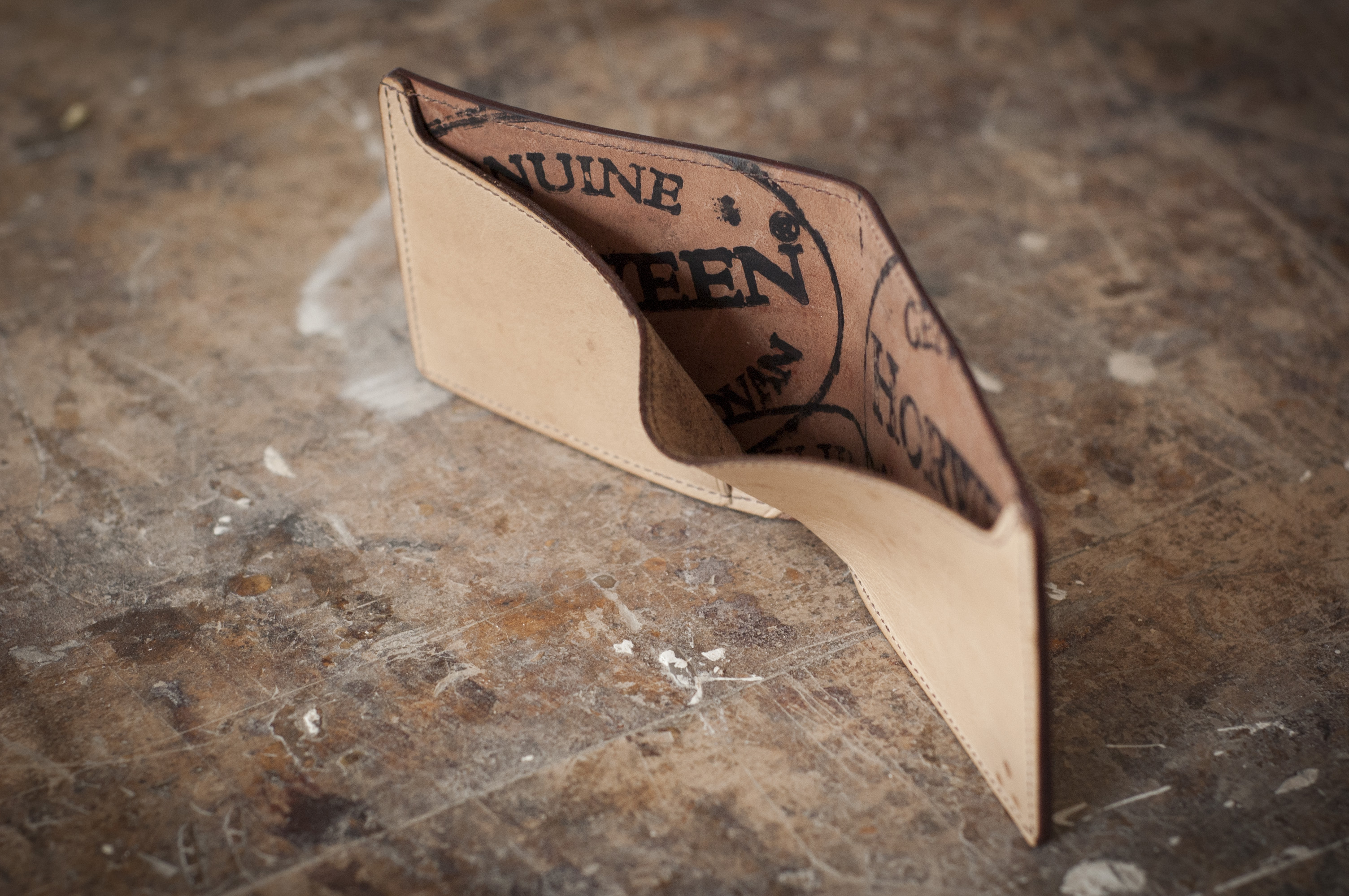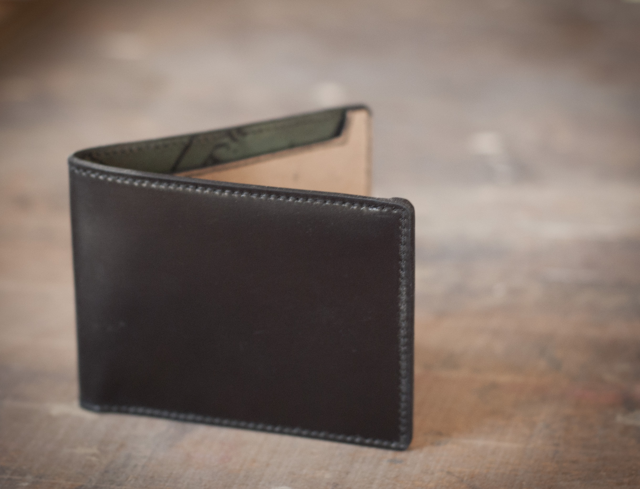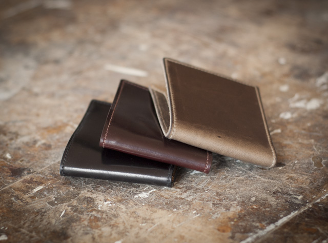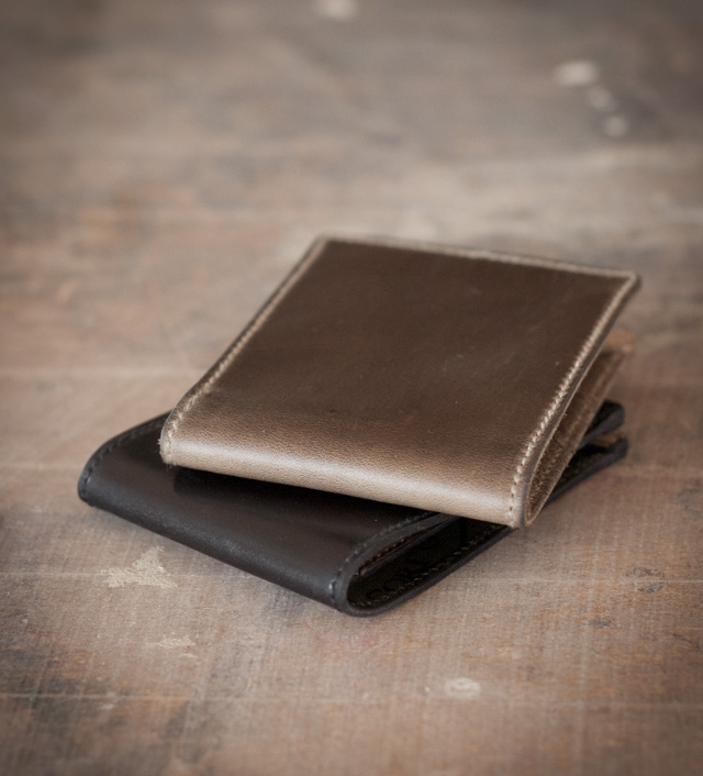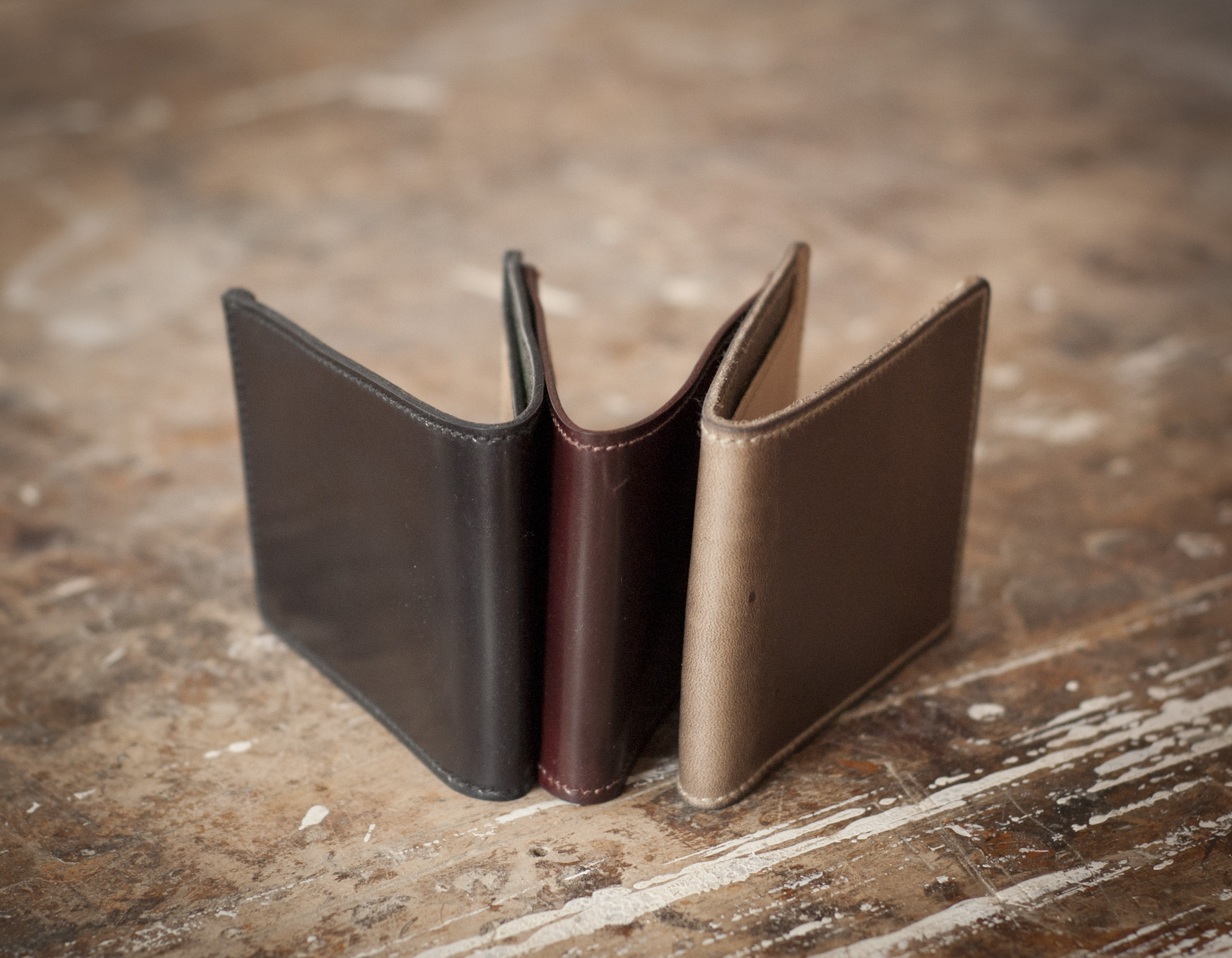 Slim bifold wallets - available in Horween® shell cordovan in black or burgundy (color #8) or Horween® natural tone Chromexcel, and one or two card slots.
