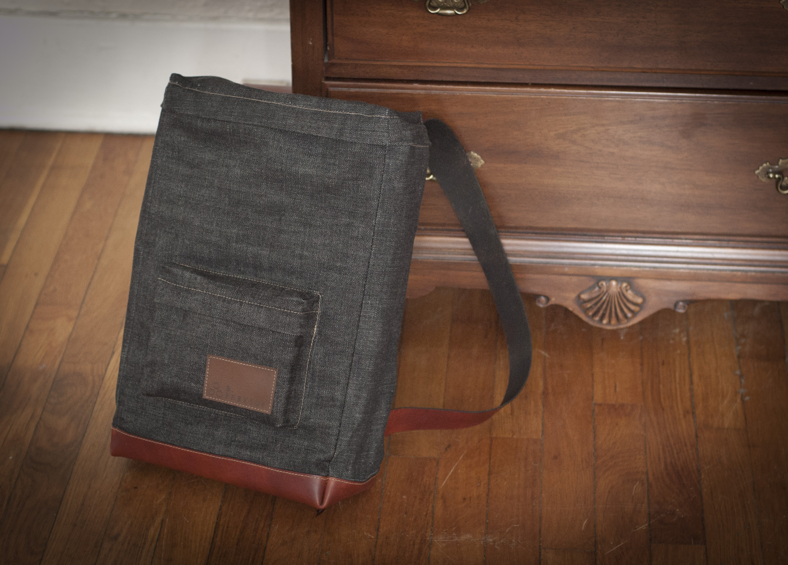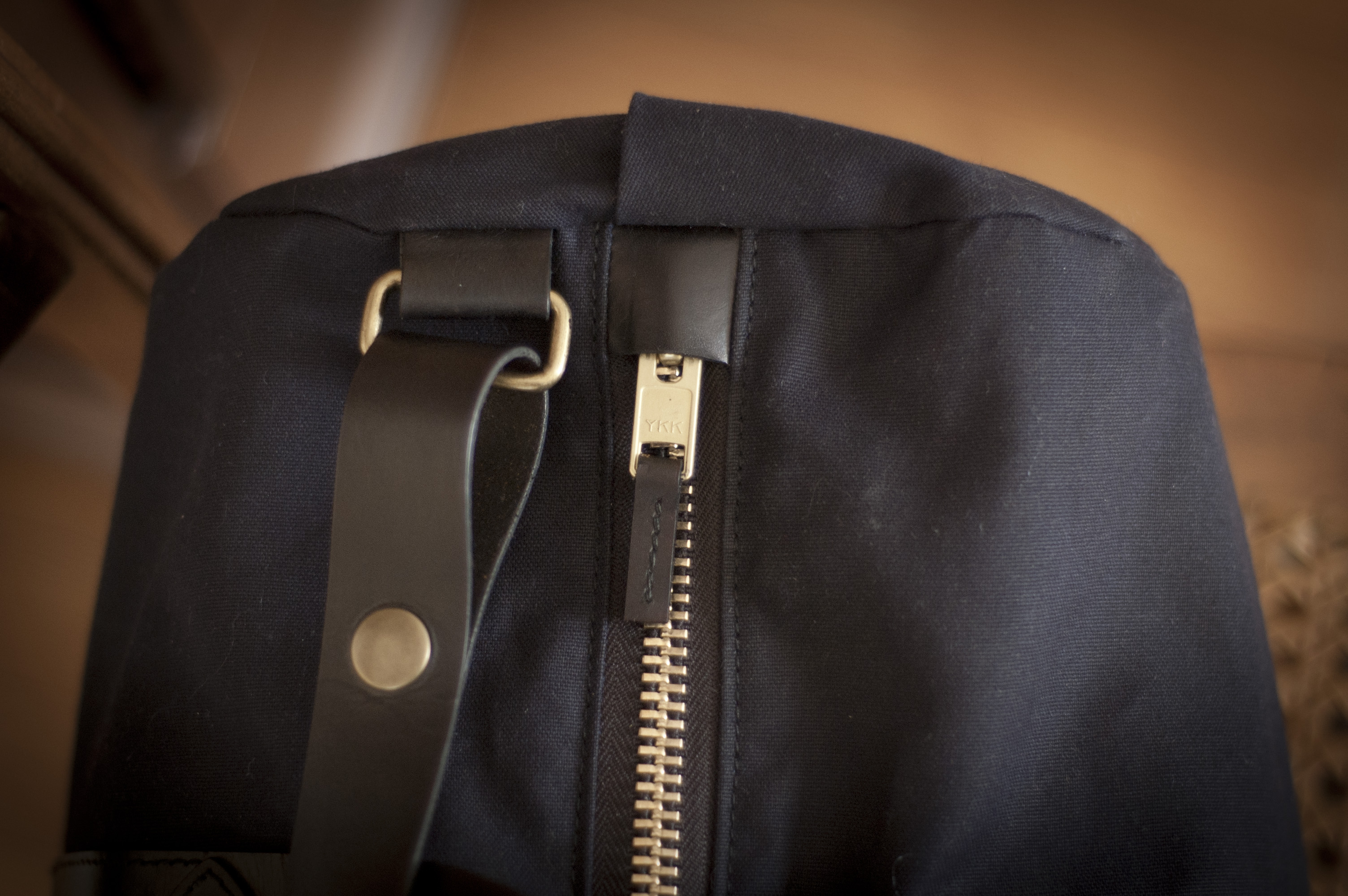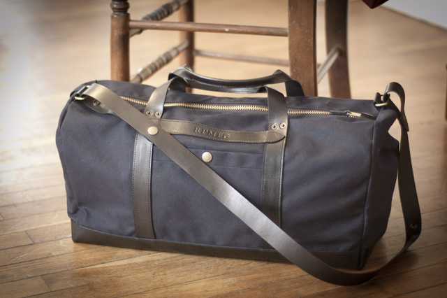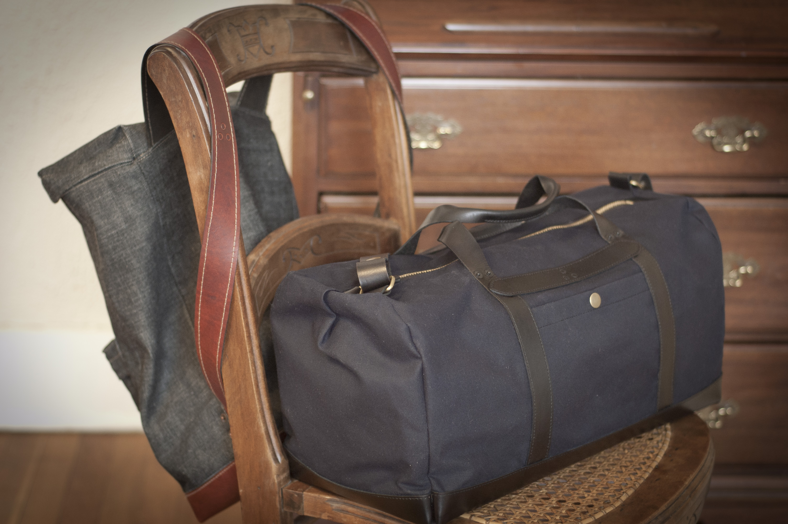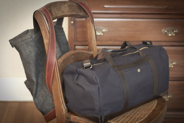 Navy waxed canvas duffel and Kuroki 16oz black denim knapsack