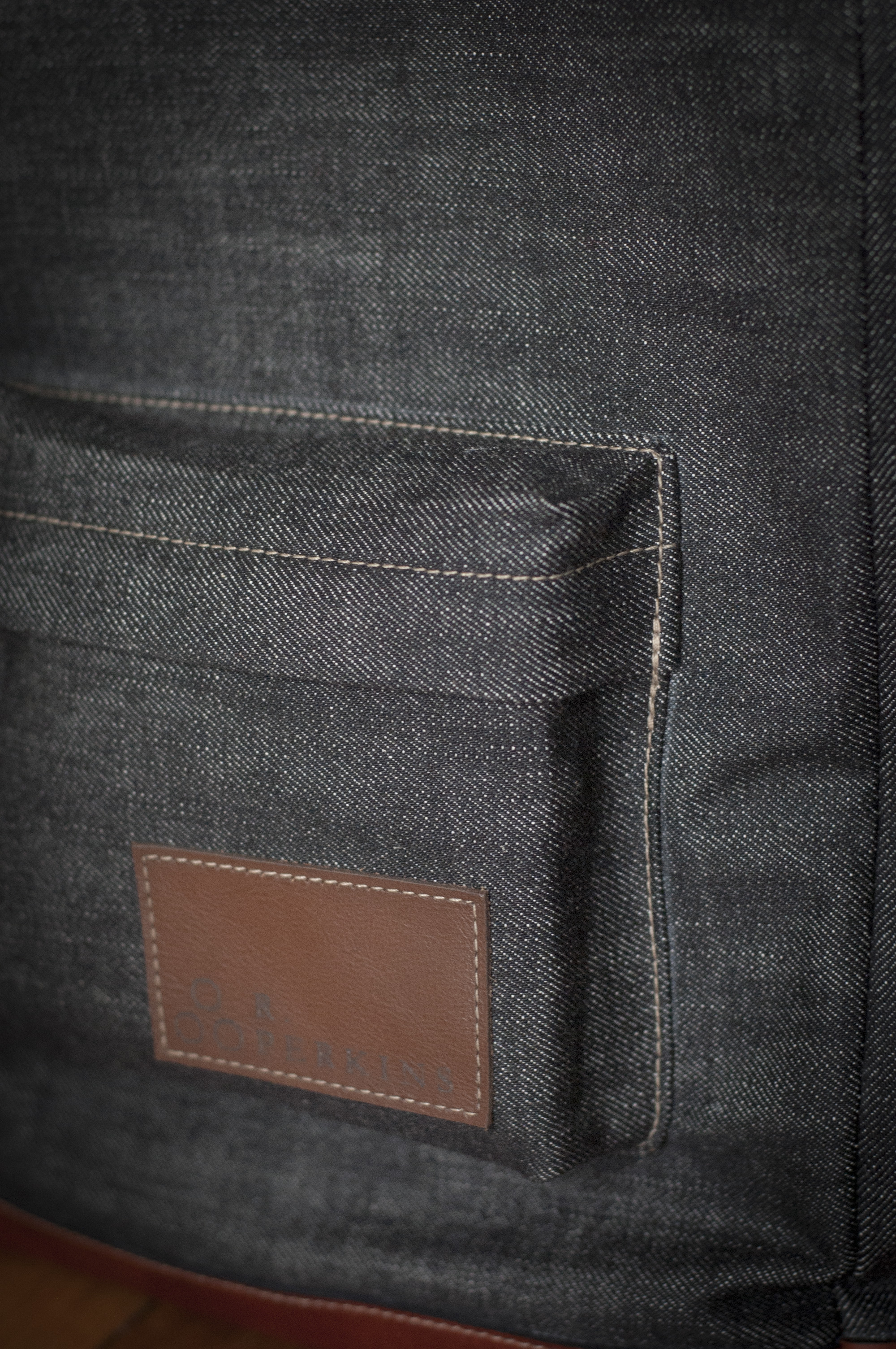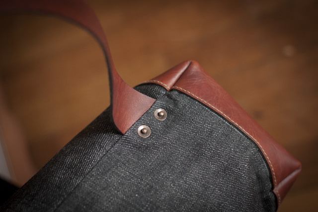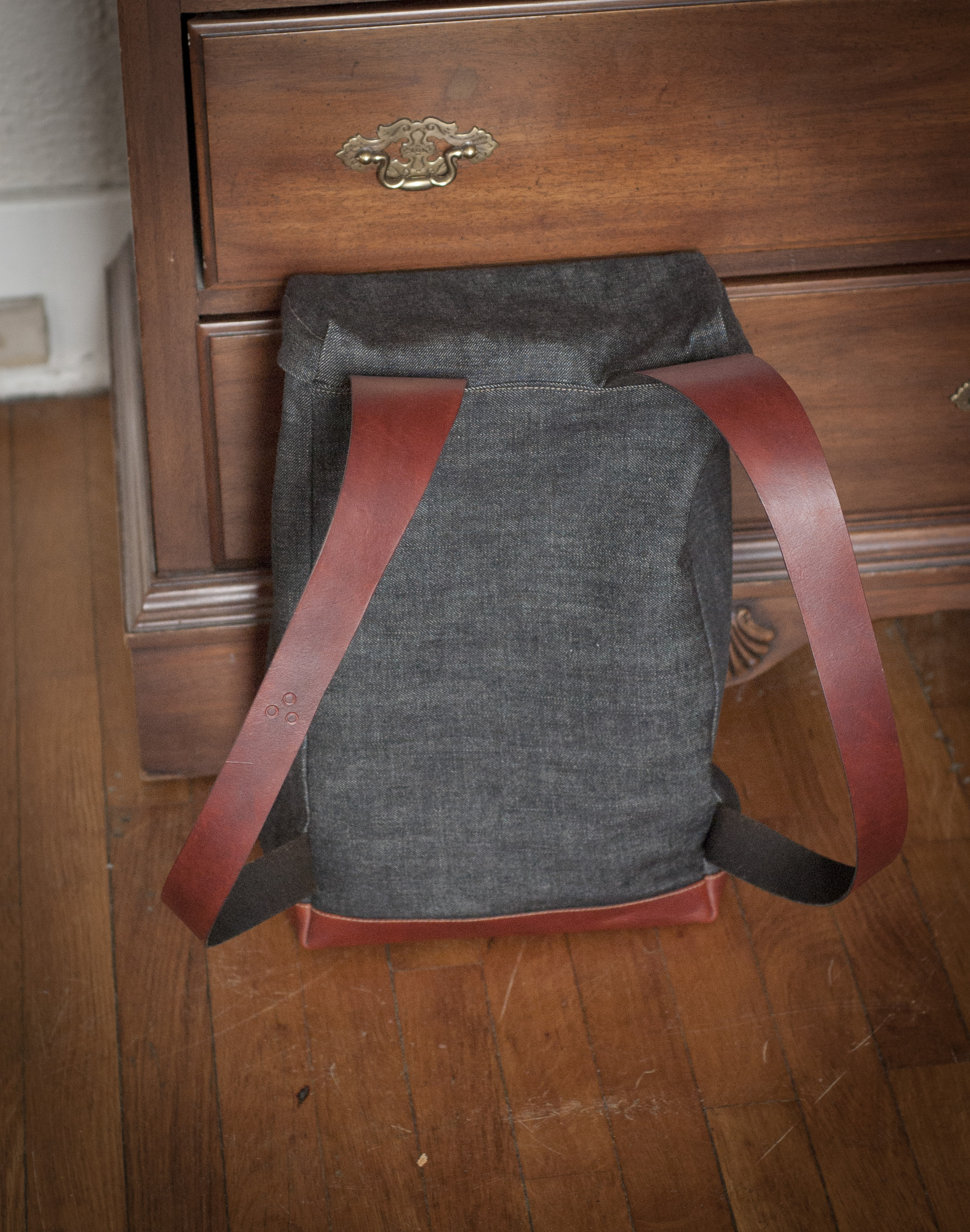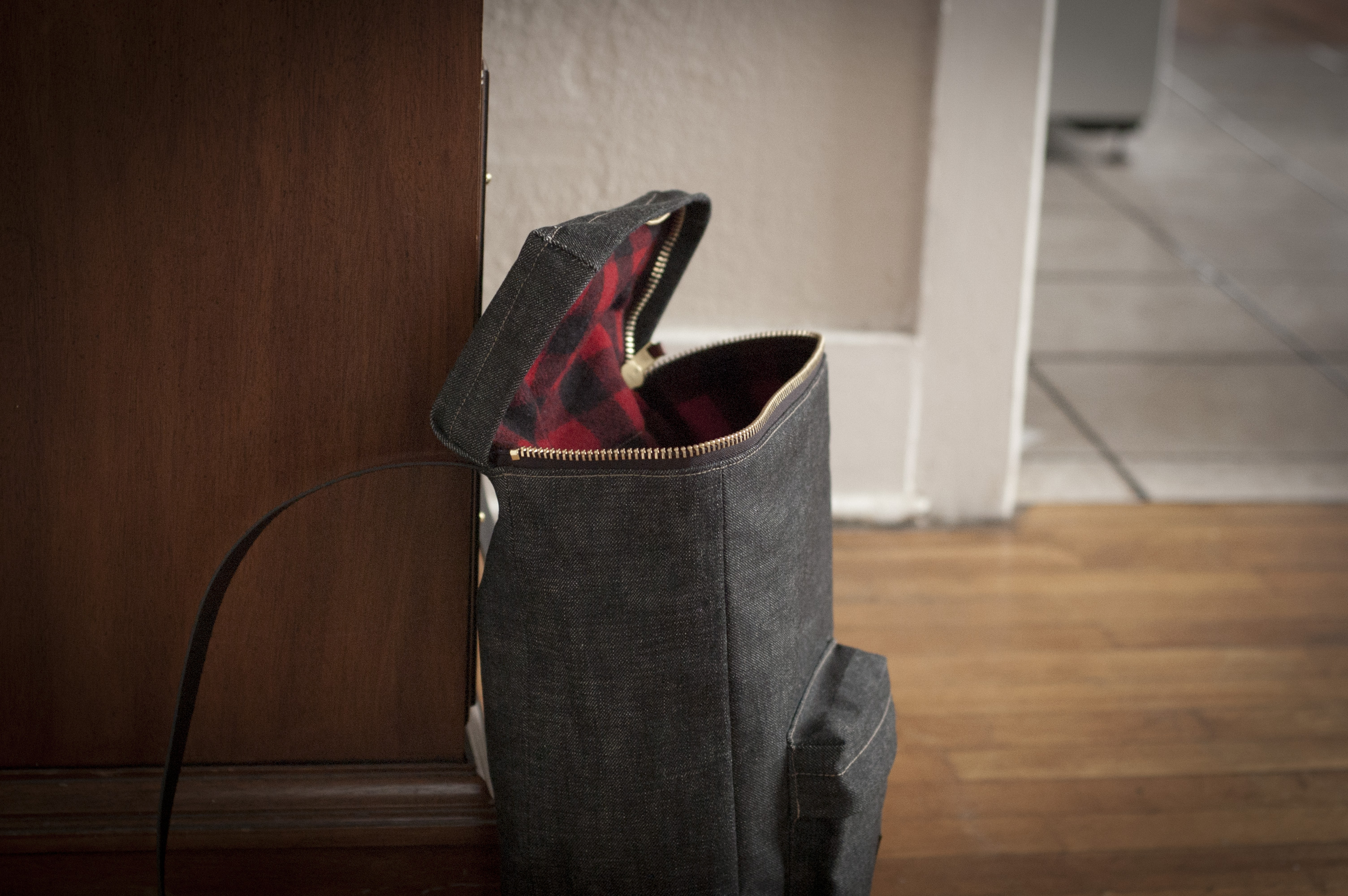 Navy waxed canvas duffel and Kuroki 16oz black denim knapsack
