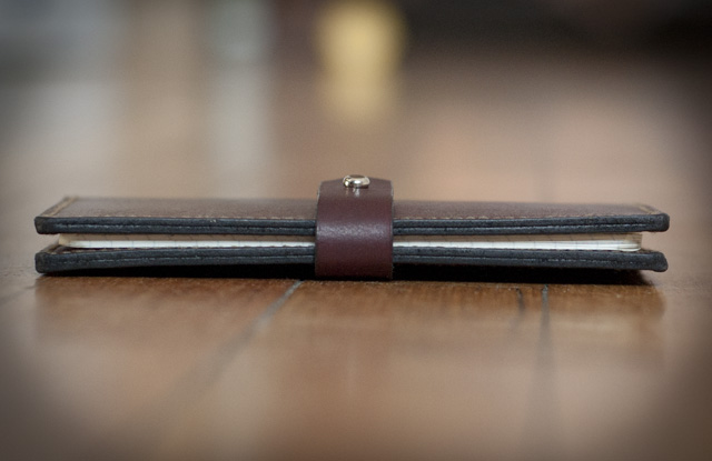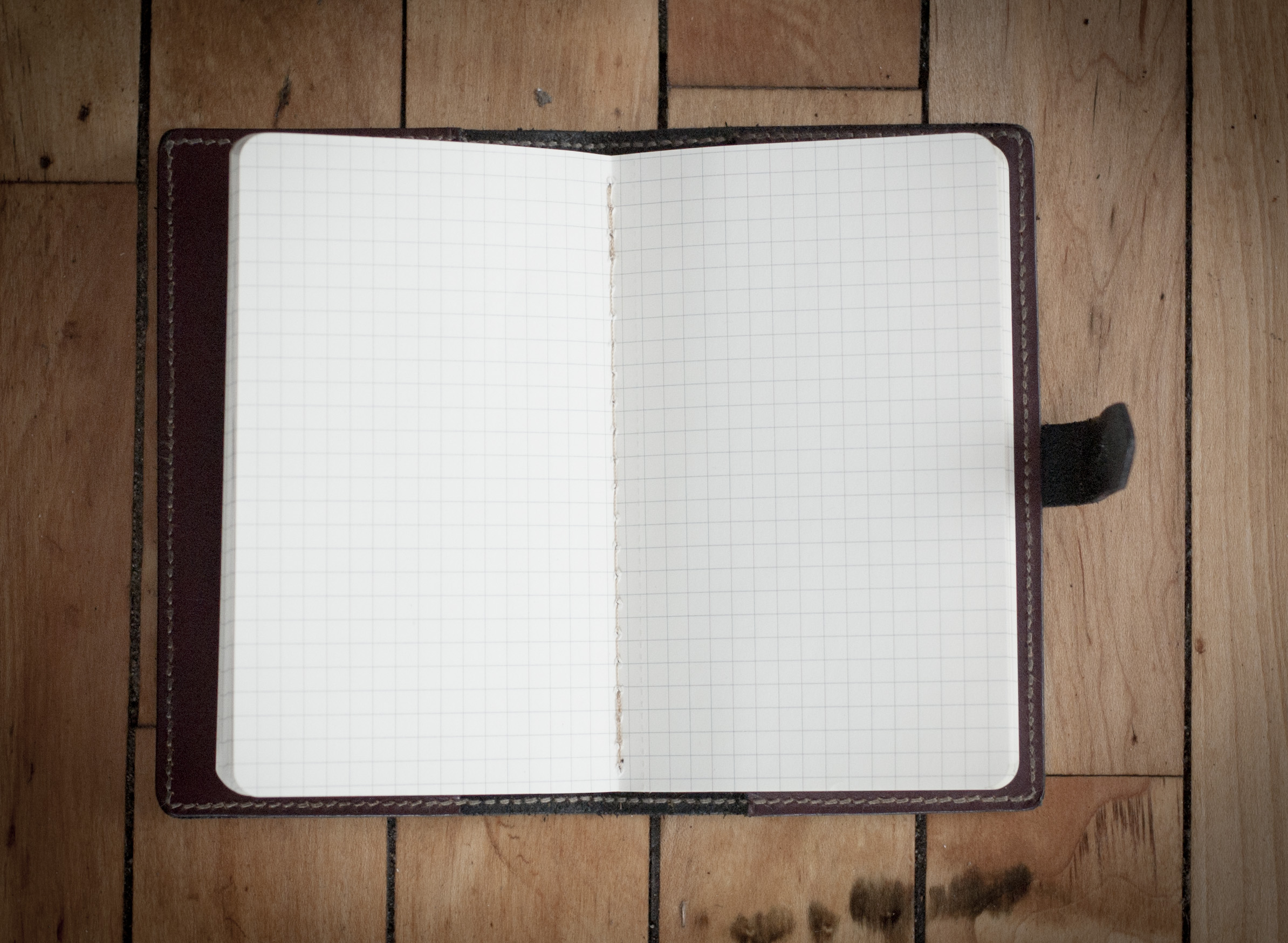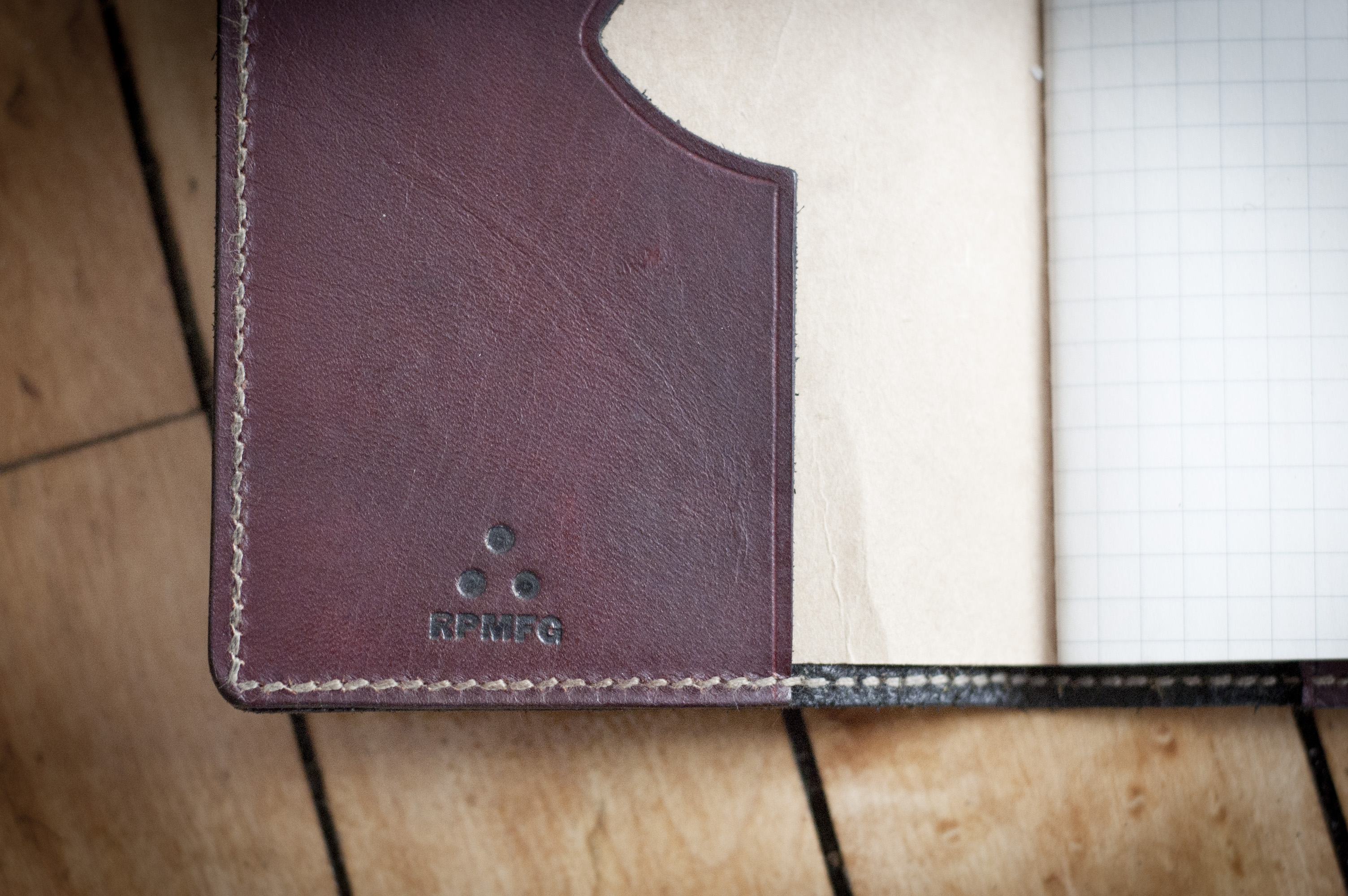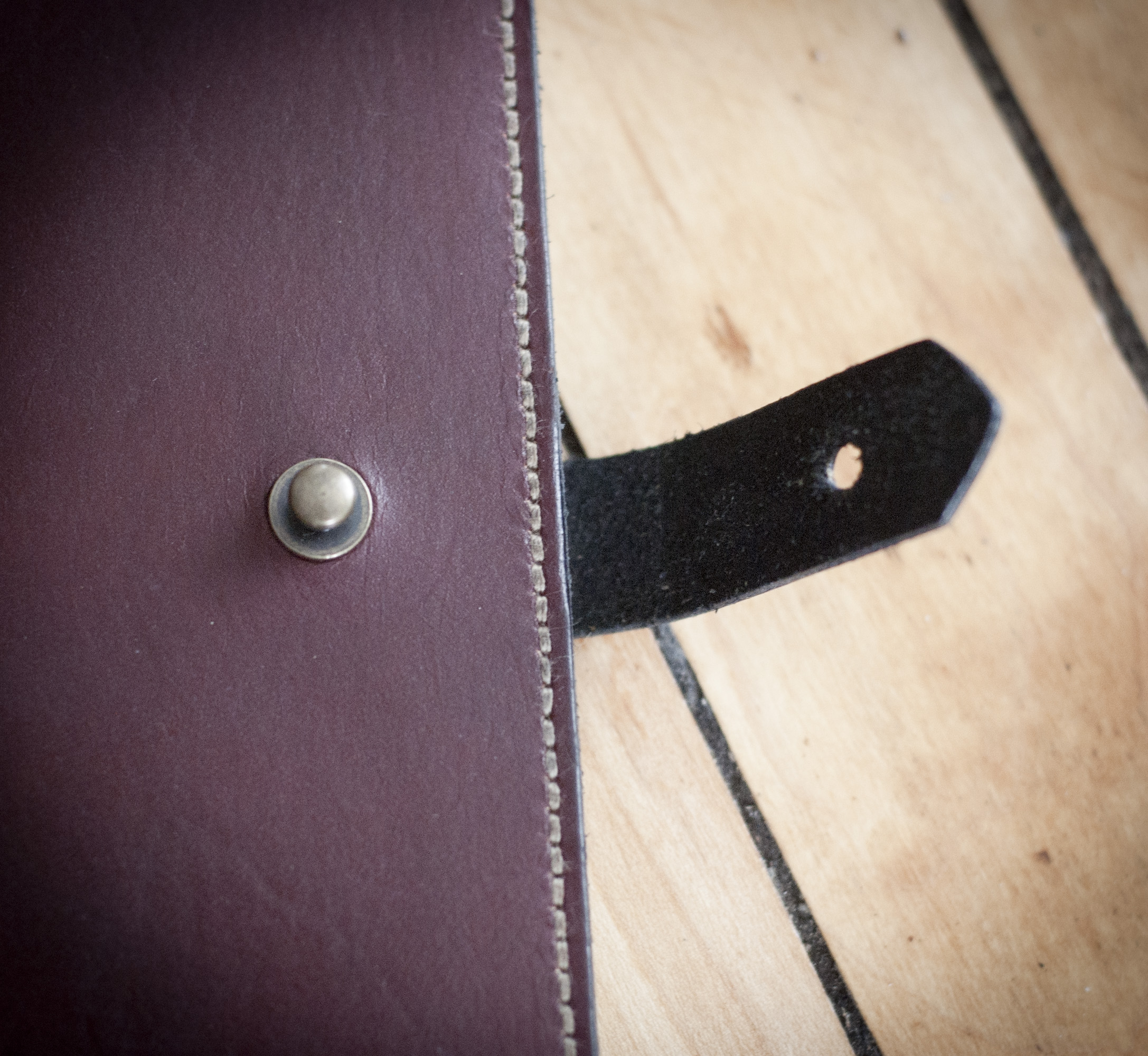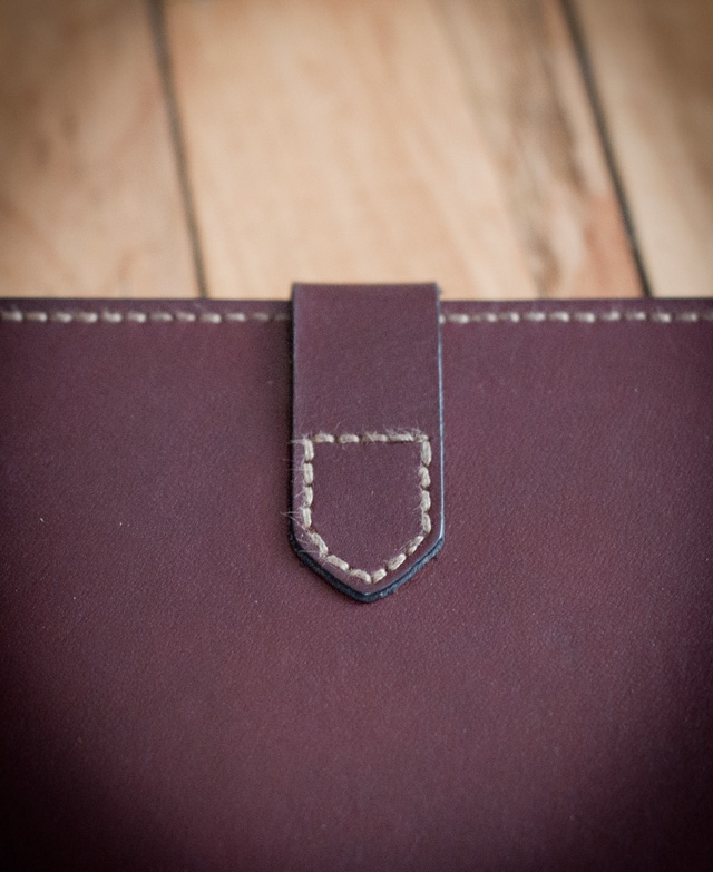 Vegetable tanned journal cover. Hand-dyed, edges waxed and burnished, solid brass stud closure. Fits Moleskine® brand 3.5" x 5.5" cahiers. Also available in natural, tan, and black, and other thread colors.