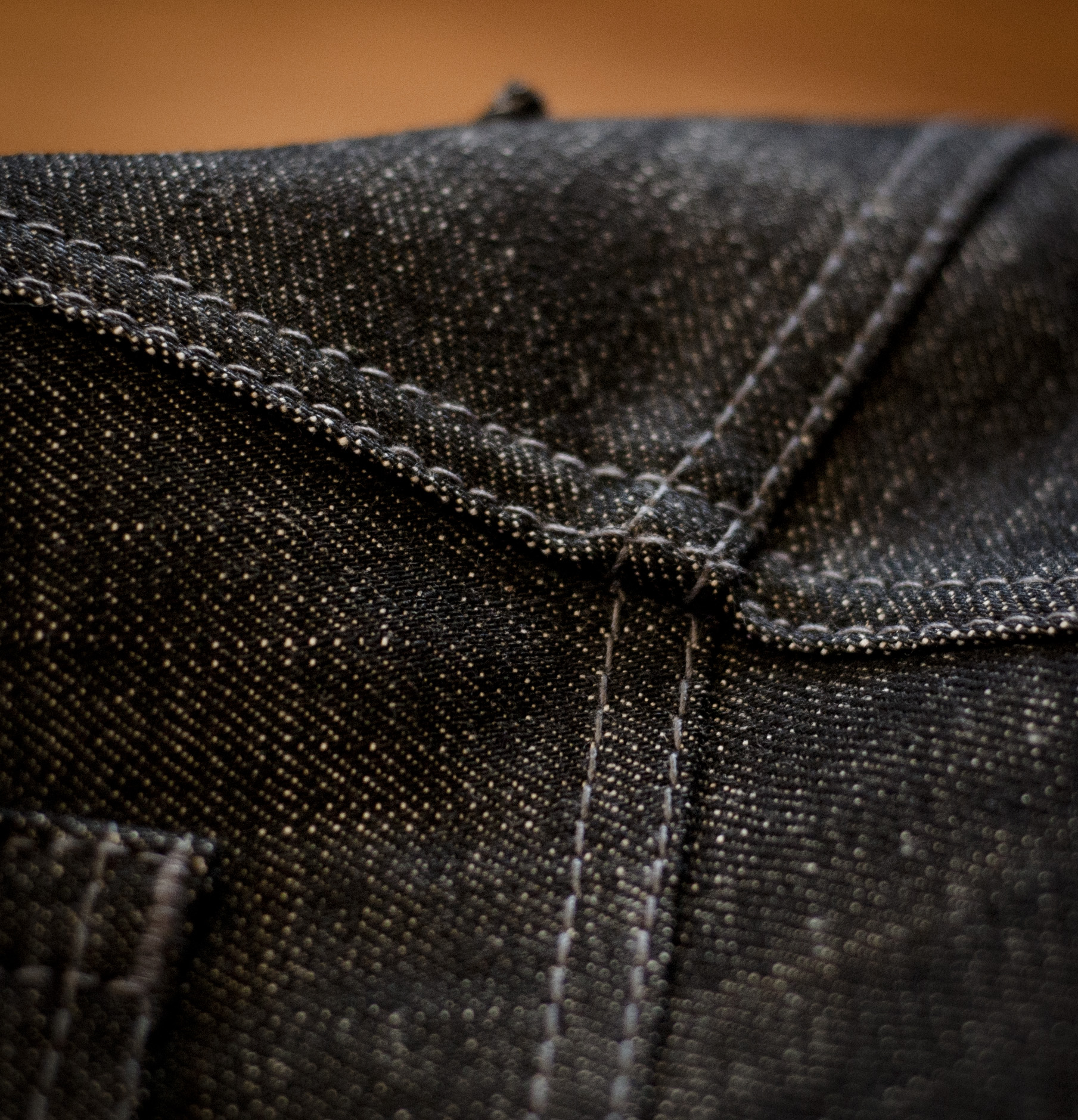 Rear pockets sewn by hand with one continuous seam, overlapped at a corner, knotted on the back of the fabric, and then tacked for strength and elegance.