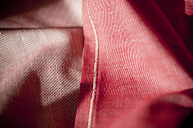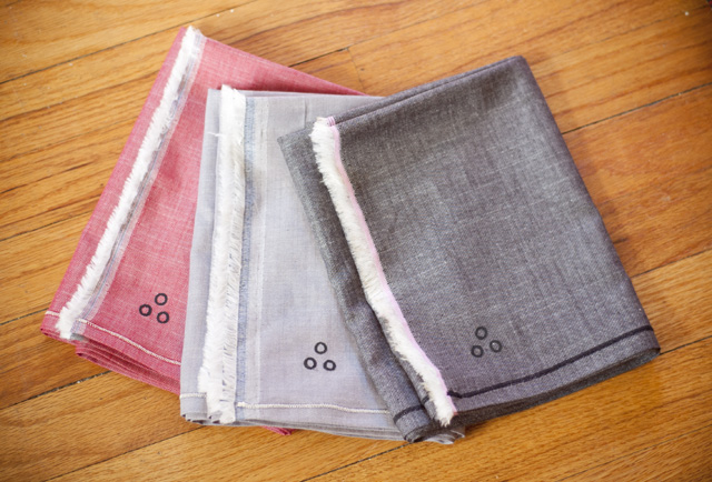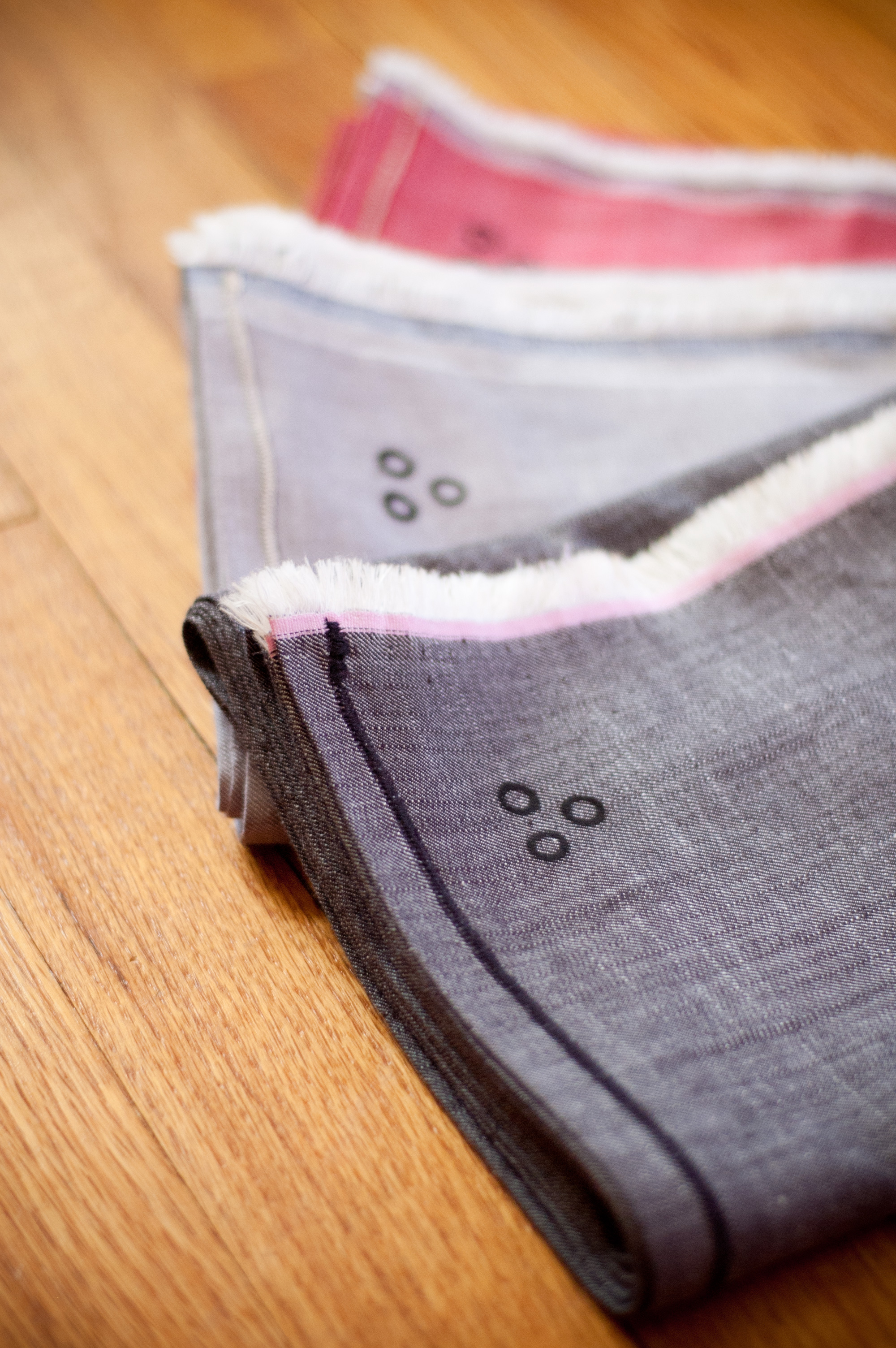 Extra-soft cotton chambray twill scarves in red, black, grey.
